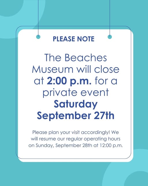 Please note that the Beaches Museum will close at 2:00 p.m. for a private event this Saturday, September 27th. Please plan your visit accordingly! We will resume regular operating hours on Sunday, September 28th at 12:00 p.m. noon.