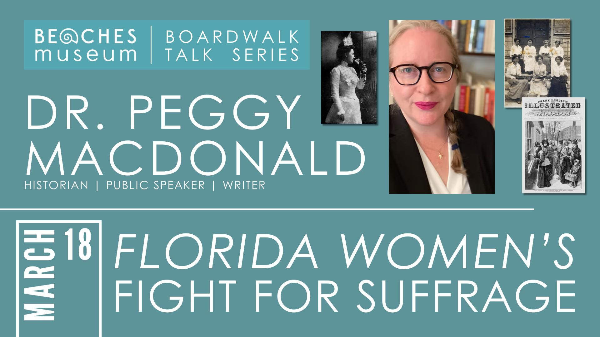 Wednesday, March 18 at 6:30 PM, join us at the Museum for a special Boardwalk Talk featuring historian Dr. Peggy Macdonald! Macdonald traces Florida’s suffrage movement from its origins to early successes, examining a selection of Florida’s most prominent suffragists like Fay Gibson Moulton Bridges, Dr. Mary McLeod Bethune, and May Mann Jennings, along with their strategies to secure the right to vote.