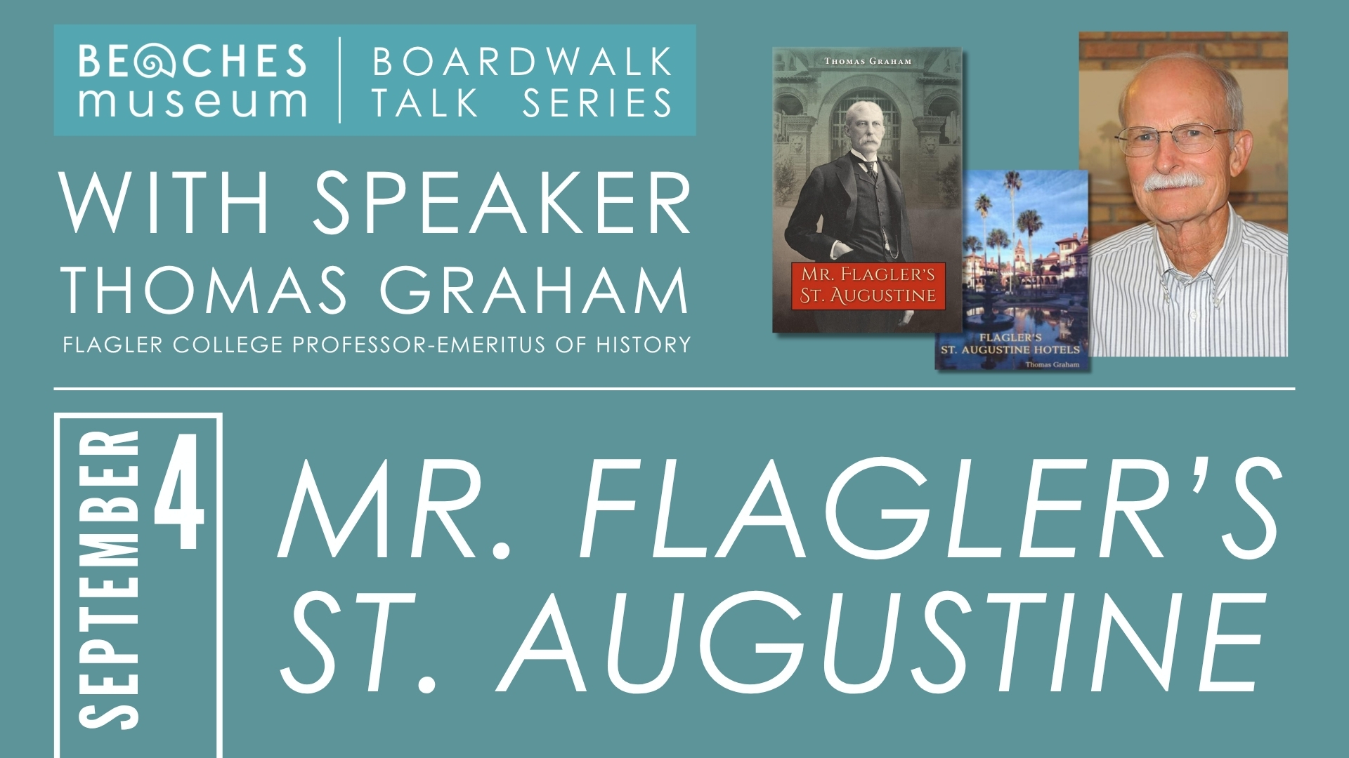 Thomas Graham has authored several books, including Mr. Flagler’s St. Augustine, which tells the same story from the St. Augustine from Flagler’s perspective, from his introduction to the state in the 1880s to the rise of his railroad and hotel empire spanning Florida from Jacksonville to Key West. More than just a St. Augustine story, Mr. Flagler’s St. Augustine tells the story of Flagler as a developer from St. Augustine to Palm Beach to Miami and finally to Key West.